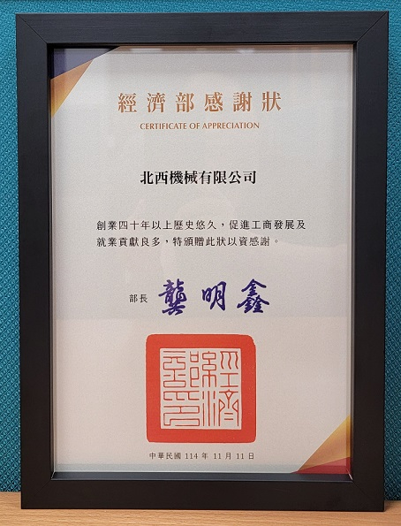 經濟部頒發感謝狀肯定北西的專業及努力.